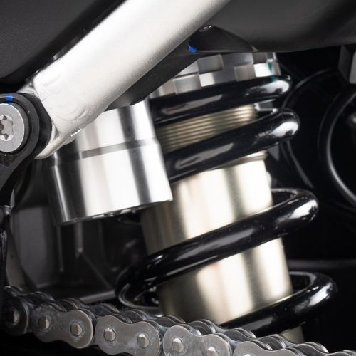 Die 49 mm YU-AN-Vorderradgabel bietet 270 mm Federweg, der Hinterraddämpfer mit externem Tank 240 mm. Beide sind komplett einstellbar und vom KOVE Rally Team für extremes Offroad abgestimmt.