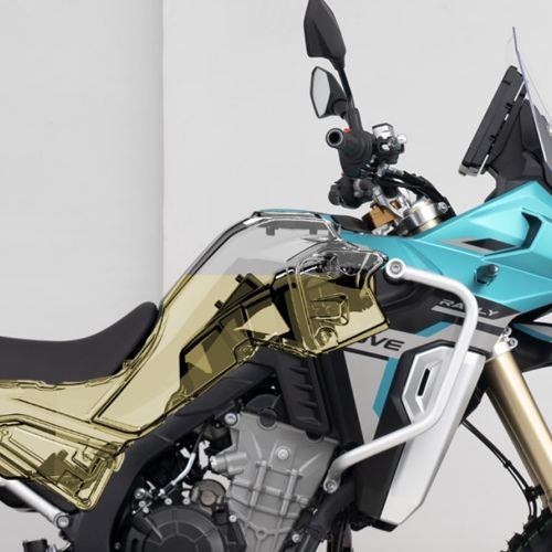 Das eigens entwickelte TAISKO-Bremssystem wurde unter härtesten Dakar-Bedingungen getestet und garantiert maximale Leistung auf schwierigstem Terrain. Der Großteil des Tankvolumens liegt unter dem Sitz – so bleibt die KOVE 800X-Rally auch vollgetankt perfekt ausbalanciert.